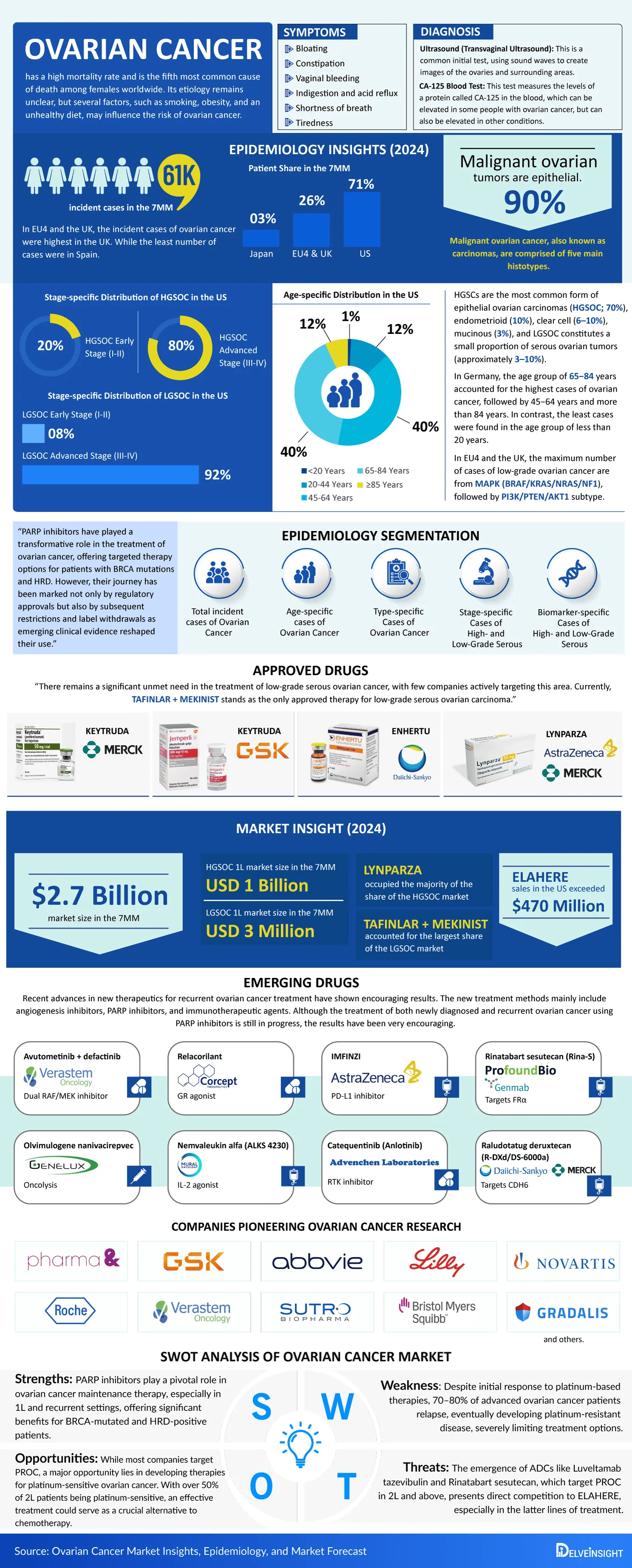 The ovarian cancer market is advancing through precision medicine and novel therapeutic approaches. Leading companies including AstraZeneca, GSK, and Clovis Oncology are developing innovative PARP inhibitors, targeted agents, and combination therapies that enhance treatment efficacy and patient survival. Refined biomarker identification and personalized treatment protocols are optimizing clinical management for this challenging gynecologic cancer.