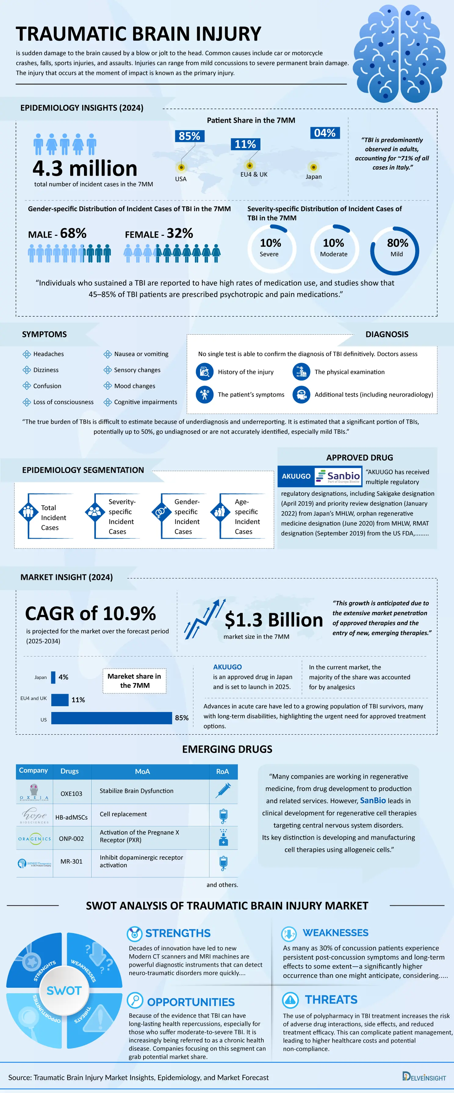 The TBI treatment landscape is evolving through neuroregenerative approaches and advanced monitoring technologies. Leading companies including BioDirection, BrainScope, and Neuren Pharmaceuticals are developing innovative diagnostics and neuroprotective treatments that enhance recovery and reduce long-term disability. Progress in biomarker identification and integrated care models is improving clinical outcomes for this complex neurological injury.